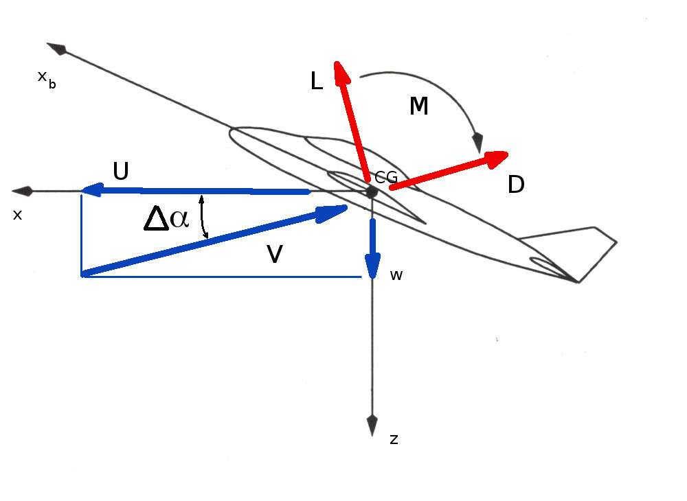 where $ΔL$ and $ΔD$ are the increments in lift and drag due to the vertical perturbation in angle. As the disturbance velocity, w, is small, $V≈U$ and $Δα≈w/U$, $\sin(Δα)≈Δα$ and $\cos(Δα)≈1$ so that