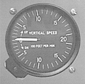 The vertical speed indicator shows the current rate of climb or descent of the vehicle in feet per minute. It is feed from a pressure line from the Static port in a similar fashion to the altimeter. However this instrument does not measure the absolute pressure but the rate at which the surrounding static pressure is changing. Its internal metering system is calibrated to give the rate of change of altitude equivent to the measured rate of change of pressure.Click on the image of this instrument to see a schematic diagram showing its internal operation.