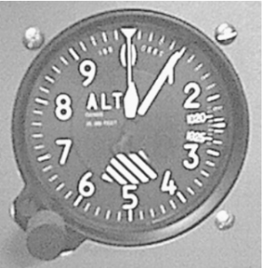 The altitude of an aircraft can be obtained by using a measurement of the static pressure of the surrounding atmosphere. A single pressure line from the Static Port is all that is required as input for the instrument. Although the rate of change of pressure with altitude is well known, based on an International Standard Atmosphere model, the ambient sea level pressure at any location of the earth’s surface can vary from day to day due to meteorological conditions. The instrument will require zeroing before and sometimes during the flight. This is done by setting the instrument to the ambient pressure of the airport at the start of the flight and resetting as required. It is therefore important to remember that this instrument measures height above sea level and not height above current ground location. For accuracy of measurement the instrument usually has at least two sometimes three indicator needles operating on different scales. For the instrument shown the larger needle indicates 100’s of feet and the smaller 1000’s of feet. Ambient sea level pressure preset value is shown in the rectangular box on the right (measured in HectoPascals). Click on the Altimeter image to view a schematic diagram showing its internal operation.