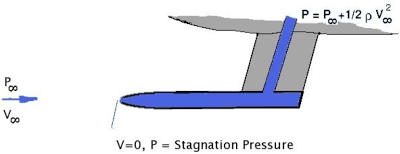 A pitot tube is used to measure the kinetic energy of the airflow due to the motion of the aircraft. The tube protrudes into the airstream and is aligned with the flow. The airstream impacting on the open end of the tube is brought to rest. The pressure at this opening will thus be the sum of the static pressure of the stream and its dynamic pressure. This is the total pressure of the flow field.