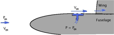 The pressure of the surrounding atmosphere is obtained through a flush mounted static port. This is usually located on the side of the fuselage in a position which will have a local surface pressure which is closely matching the stream ambient atmospheric air pressure. The position must be calibrated and not where there is significant pressure change due to the pressure field of the wings, flow separations from joins or protrusions on the fuselage, propellor slipstream or jet wake effects.
