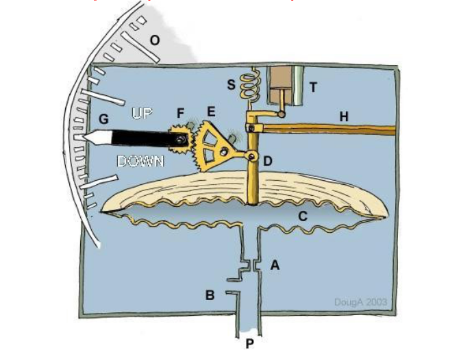 Pressure from the static port (P) enters the instrument via tube (B) and surrounds the cannister (C). Pressure from the static port (P) also enters the cannister (C) via a fine metered tube (A).