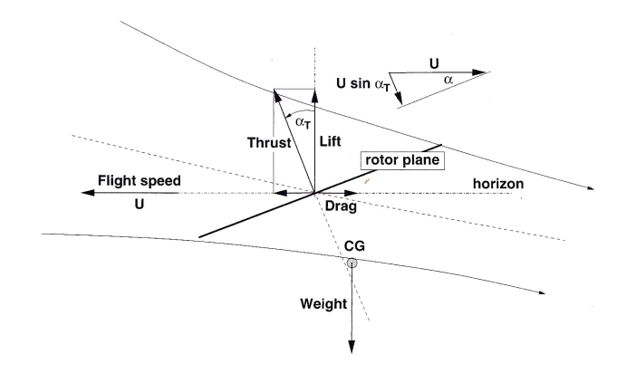 In the above example the rotor would be producing a forward component of thrustThis may or may not be sufficient to overcome the drag components so that a stable forward velocity is achieved. This can only be calculated once values for the total drag and power components have been established.