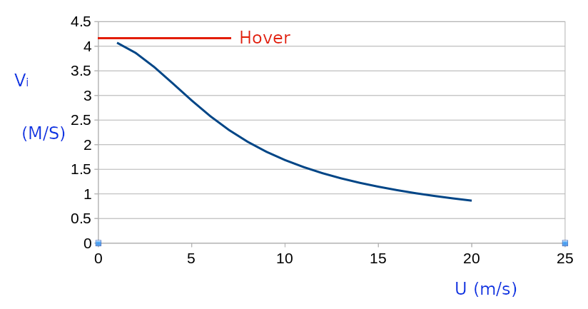 For example, given a typical helicopter weighing 1400 Kg with rotor diameter 20m flying at sea level, with the rotor tilted at 5 Degrees, the required induced velocity produced by the rotor for level flight at varying forward speeds is shown in the figure below.