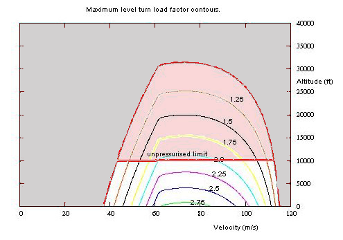 Separately it is possible to determine the turn rate available at these load factors. By mapping, contours of maximum turn rate for different speeds and altitudes can be obtained.