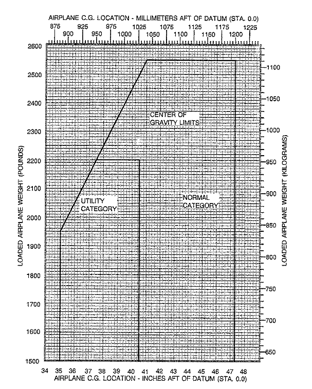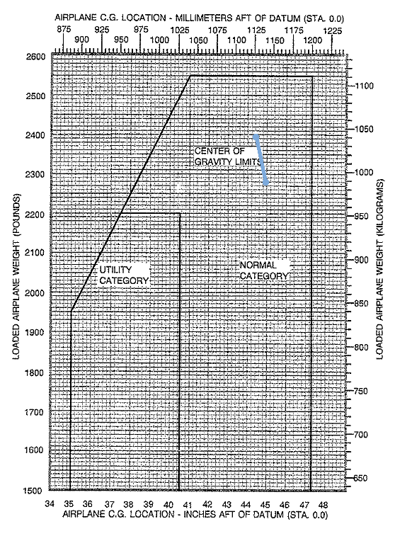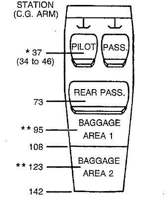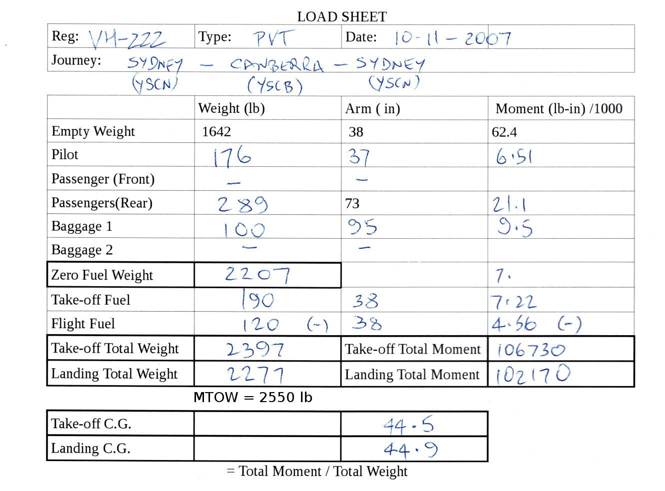 For each flight a pilot in command is required to determine the weights of passengers, luggage and fuel. These will be used in a moment calculation to find the take-off and landing C.G. positions. These can be plotted on the above graph to verify that C.G positions during flight will lie within the acceptable bounds of the envelope.