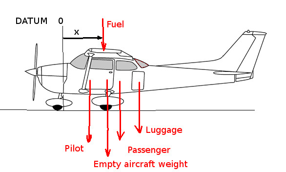 $$W_{total}×x_{cg}=W_{empty}×x_{ew}+W_{pilot}×x_{p1}+W_{passenger}×x_{p2}+W_{luggage}×x_l+W_{fuel}×x_f$$