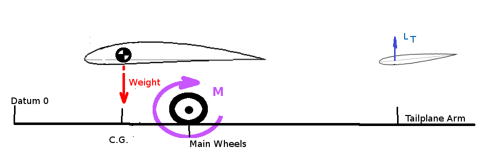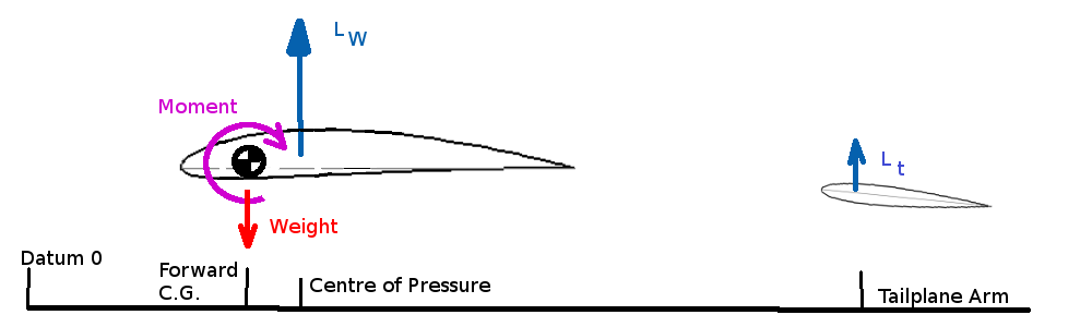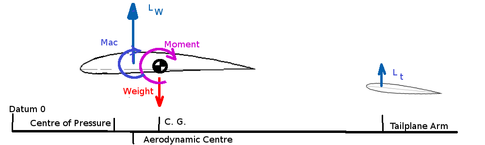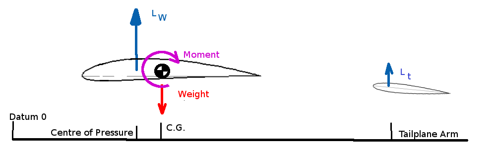 where $L_w$ is the lift of the wing and fuselage, $L_t$ is the lift of the tailplane, $x_{cp}$ is the position of the center of pressure due to wing lift, $x_{tail}$ is the position of the tailplane center of pressure and $x_{cg}$ is the position of the centre of gravity. All positions being measure from the datum point.