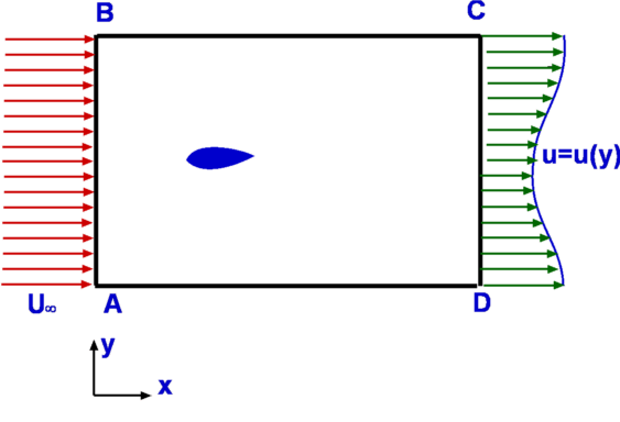 To undertake the analysis a control volume ABCD is selected. The left and right hand boundaries AB and CD are far from the body. The flow is uniform ( at a speed $U_{∞}$) on AB. At the right hand boundary, CD, is the wake with the velocity profile as shown, equal to freestream at the edges but with a deficit in the center. It is assumed that the top and bottom boundaries of the control volume, AD and BC are far away from the body and the vertical component of velocity, v, is zero across them.