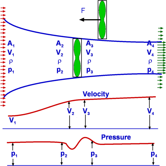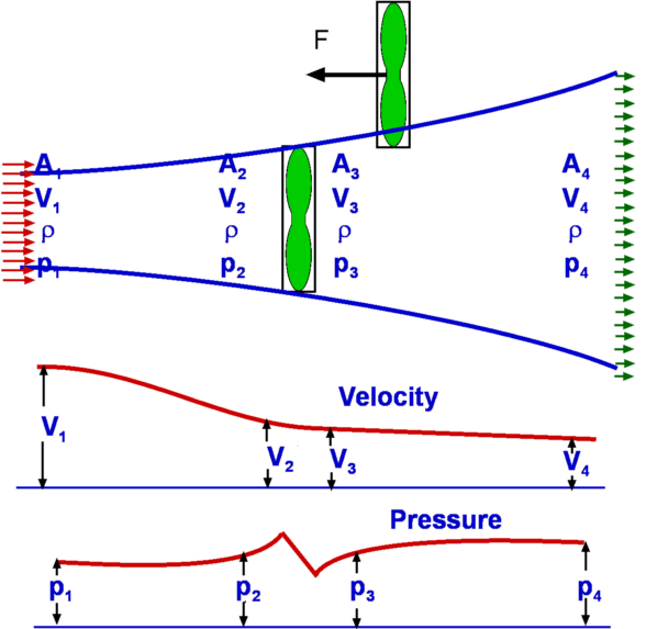 A wind turbine (Fig 8) extracts energy from an air stream while a propeller adds energy to the air stream. The analysis follows the same lines. For the wind turbine the result is