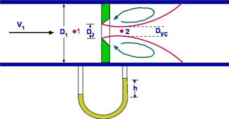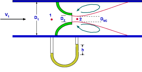 A fully developed flow prevails at the upstream of the orifice. The presence of the orifice causes the flow to accelerate through it thus increasing the velocity. The flow will separate from the sharp edges and take a length of pipe to return to a fully developed flow covering the complete area. A slow moving recirculating flow develops behind the plate. This recirculating mass of fluid acts as an obstruction in the flow and forms a curved bounday between the slow moving mass and the fluid coming through the orifice. As a consequence the smallest diameter of flow is not equal to the orifice diameter, but slightly smaller and at a position downstream of the orifice.(2)