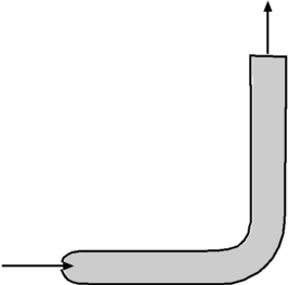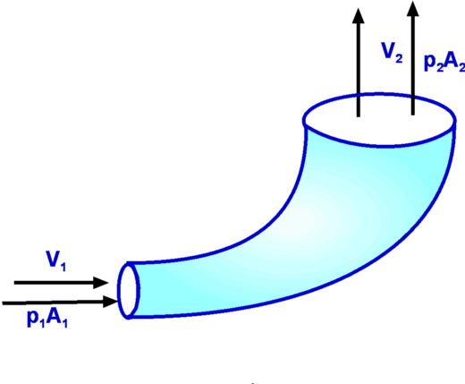 Consider a flow through a pipe bend as shown. The flow enters the bend with a speed V1 and leaves it a speed V2, the corresponding areas of cross section being A1 and A2 respectively. The velocities have components u and v in x and y directions. It can be assumedn that the flow is uniform over the inlet and outlet faces. As the flow negotiates the bend it exerts a force upon it. This force is readily calculated by the momentum theorem.