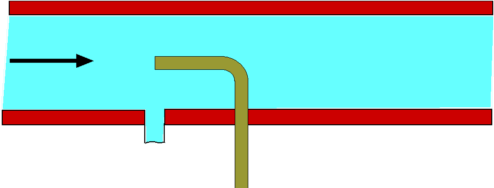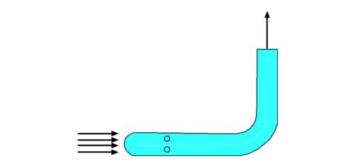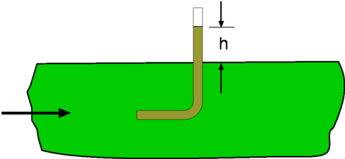 Measurement of stagnation pressure requires that the flow be brought to rest. A glass tube or a hypodermic needle aligned with the flow and facing upstream as shown in Fig. 12 will do the job. Alternately, what is called a Pitot Tube shown in Fig.13, with a hole facing upstream of the flow may be employed. The method shown in Fig. 14 allows both pressures to be measured at once.