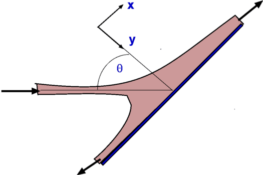 Define x and y axes parallel and perpendicular to the surface as shown and chose a control volume surrounding the fluid and cuting through inlet and outlet streams. At the entry to the control volume we have the momentum in the y-direction equal to