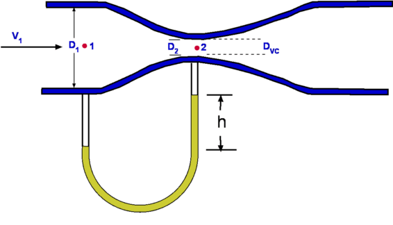The above equation gives the mass flow rate through the pipe in terms of the pressure drop and the areas. The equation gives only a theoretical value. In order to obtain a more realistic value the actual area at the minimum cross section (2) or the Vena Contracta needs t be found and used in the calculation. In addition losses may not be negligible. The extent of losses is a function of the Reynolds number. In practice, a Coefficient of Discharge, C is defined such that,