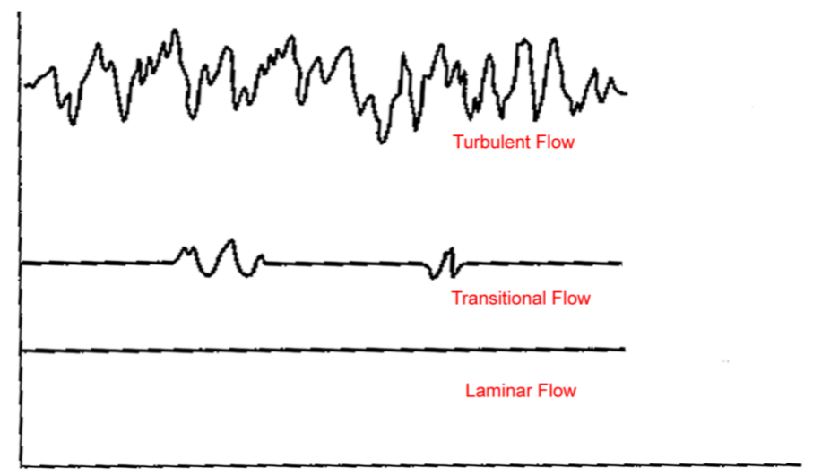 To measure in detail what is happening an experiment may be conducted using modern day electronic equipement, Hot Wire Anemometer. This instrument measures instantaneous velocities at a point. The traces of velocity at the three regimes of flow are shown in Fig.3. Laminar flow has a predominant velocity in the main flow direction, turbulent flow has a significant component of velocity in the flow normal direction. While laminar flow is "orderly" turbulent flow is "Random" and "Chaotic".