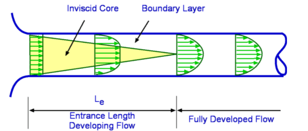 Consequently the velocity components are each zero on the wall, ie., u = v = 0. The flow adjacent to the wall decelerates as it travels along the pipe. The boundary layer close to the wall has an established velocity profiler. Viscous effects are dominant within the boundary layer. Outside of this layer the inviscid core remains until boundary growth from opposite sides joins at the centerline. This can be seen in Fig.4. Once this has taken place, the inviscid core terminates and the flow is completely viscous. The flow is now called a Fully Developed Flow. The velocity profile becomes parabolic and does not vary in the flow direction. In this region the pressure gradient and the shear stress in the flow are in balance. The length of the pipe between the start and the point where the fully developed flow begins is called the Entrance Length. Denoted by Le, the entrance length is a function of the Reynolds Number of the flow. In general,