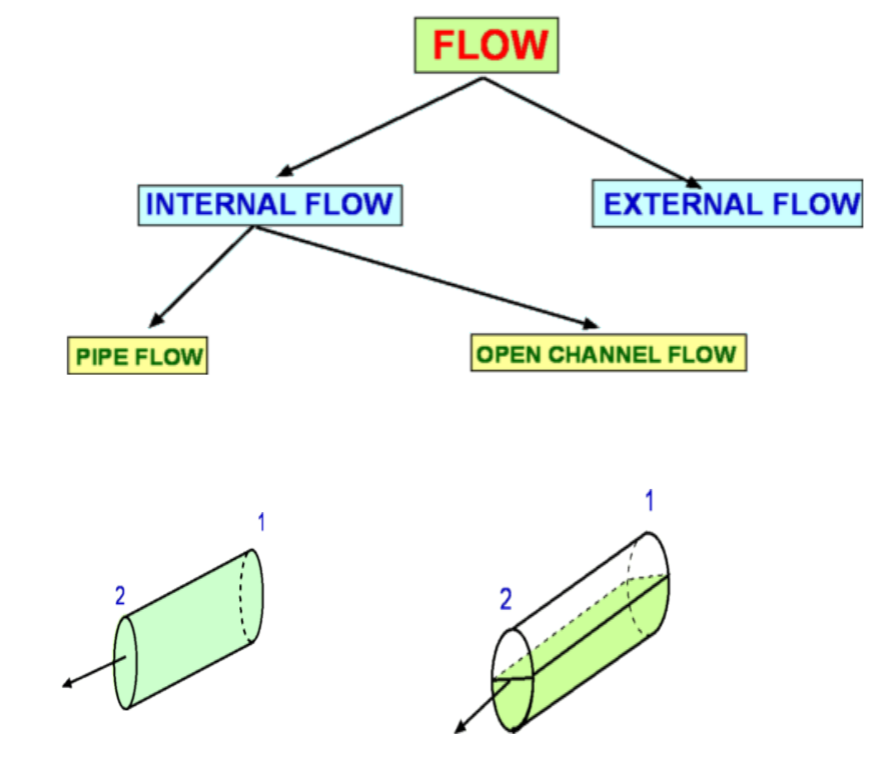 A flow can be an Internal flow or an External Flow. Internal flows are further classified into Pipe Flows and Open Channel Flows. A pipe flow is one where the fluid fills the conduit completely. The main driving force is pressure although gravity may also be contributing to the flow. Open Channel Flow is open where the fluid does not fill the conduit completely. The driving force is gravity.