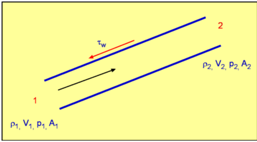 Note that every term in the above equation has the dimension of length. As a fully developed flow is being considered , then α1 = α2 . There are no external features between (1) and (2) which could add or remove energy. As a result, loss of head is given by,