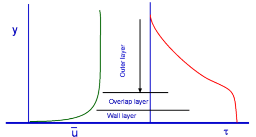 Based on experimental findings a velocity profile can be arrived at called the Logarithmic Overlap Law. This is constructed as shown below.