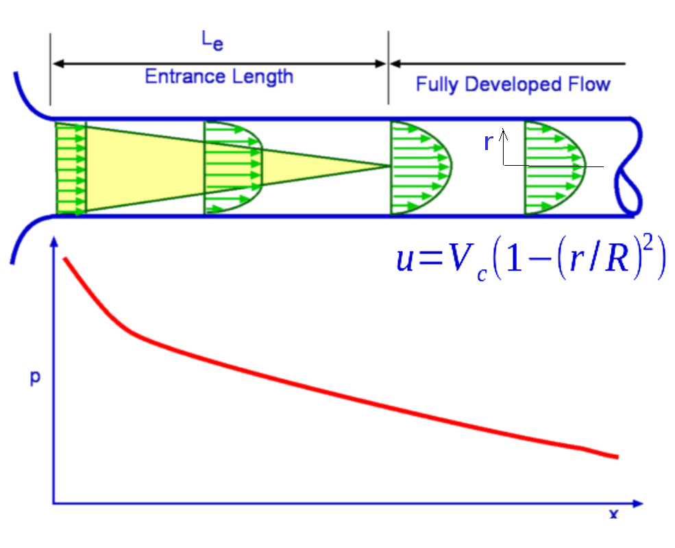 The forces acting along the pipe are inertial, viscous force due to shear and the pressure forces. Gravity can be ignored if the pipe is horizontal. When the flow is fully developed the pressure gradient and shear forces balance each other and the flow continues with a constant velocity profile. The pressure gradient remains constant. In the entrance region the fluid is decelerating. A balance is achieved with inertia, pressure and shear forces. The pressure gradient is not constant in this part of the flow and decreases as shown in Fig.5 .