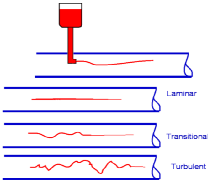 A flow can be Laminar, Turbulent or Transitional in nature. Very different results are obtained depending on which type of flow is encountered. This was demonstrated in the experiments conducted by Osborne Reynolds (1842 - 1912). Into a flow through a glass tube (Fig.2.) he injected a dye to observe the nature of flow. When the speeds were small the flow followed a straight line path (with a slight blurring due to dye diffusion). As the flow speed was increased the dye fluctuated and intermittent bursts were observed. As the flow speed was further increased the dye was blurred and began to fill the entire width of the pipe. These different results demonstrate Laminar, Transitional and Turbulent Flows.