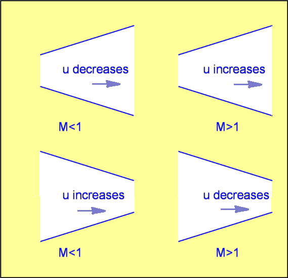 - For supersonic flows, $M>1$ , as the area decreases velocity also decreases, and as the area increases, velocity also increases. In response to an area change all the static properties change. At subsonic speeds changes in density are small. The velocity decreases when there is an increased area offered (and vice versa). But in case of a supersonic flow with increasing area density decreases at a faster rate than velocity. In order to preserve continuity velocity now increases (and decreases when area is reduced).