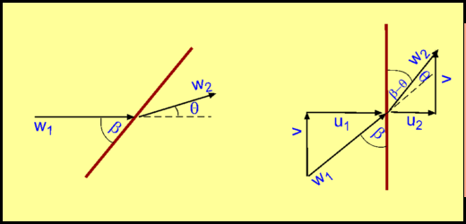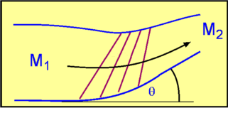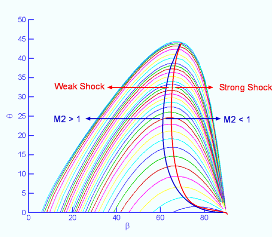 $${\tan(β-θ)}/{\tan(β)}=u_2/u_1={(γ-1)M_1^2\sin^2(β)+2}/{(γ+1)M_1^2\sin^2(β)}$$