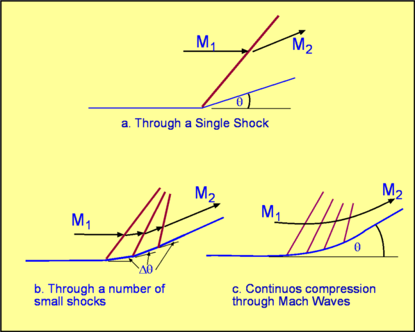 Secondly, consider compressing the flow through a number of shocks, say $n$ . Each shock is such that the flow downstream is supersonic. The flow turning angle through each of the shocks is $Δθ= θ\/n$. Consequently through n shocks,