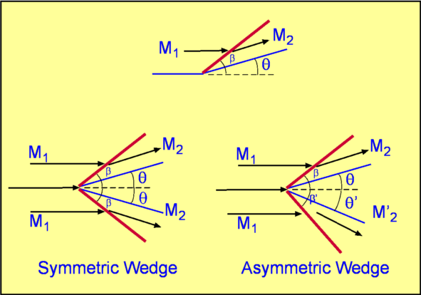 A supersonic flow at Mach Number $M_1$ running past a concave corner inclined at an angle $β$ to the incoming flow is shown in Fig. 29. At the corner, the flow has to turn though an angle $θ$ because of the requirement that the normal component of velocity at any solid surface has to be zero. To facilitate this turn we require an oblique shock at an angle $β$ to form at the corner. The shock angle can be calculated for a given Mach Number and angle $θ$. The same theory can be applied in case of a symmetric or asymmetric wedge of half angle $θ$ as shown in Fig. 29.