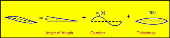 A general aerofoil placed in a supersonic flow Fig. 47, can be considered as being the linear superposition of a flat plate at angle $α$, a flow deflection due to camber, $α_c(x)$, and a flow deflection due to thickness, $h(x)$. For this case,