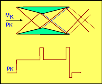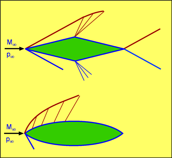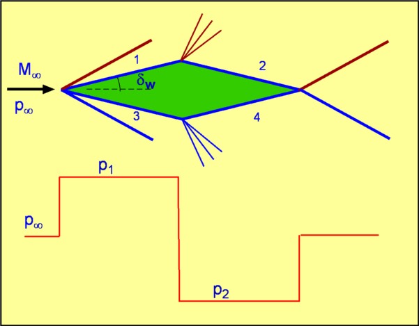 The flows sees the leading edge on the upper surface as a convex corner. A Prandtl-Meyer expansion results. At the trailing edge the flow is compressed through a shock back to the horizontal stream direction. At the leading edge on the lower surface is a shock since it forms a concave corner. The flow leaves the trailing edge through an expansion fan. A close look at the flow just after the trailing edge shows that there are two streams of gas - one, processed by expansion and shock on the upper surface and the other, gas processed by similar features on the pressure side. The two shocks are not of the same strength. Consequently the gas streams are of different densities and temperatures. However, the pressures and flow angles are equalised at the trailing edge. This gives rise to a slip stream at the trailing edge. From the pressure distribution shown, lift and drag can be calculated as