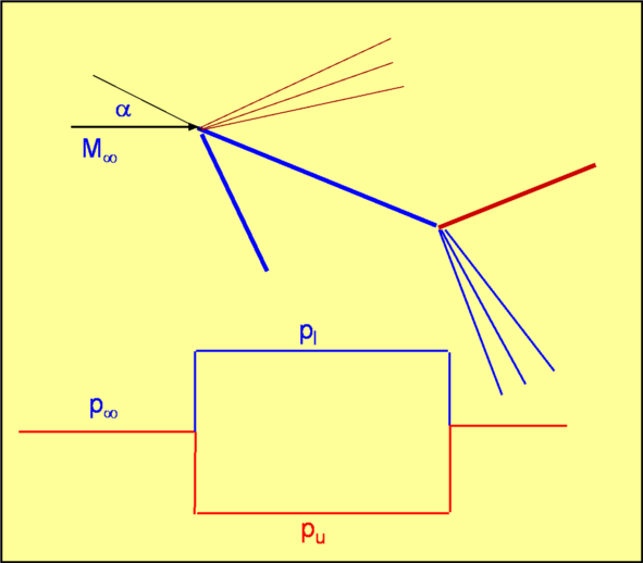 The Shock-Expansion technique is accurate, however, it requires individual summation of surface components and hence and is thus a complex numerical process. A closed form solution can be found if the aerofoils are considered thin and only weak oblique wave shocks are considered. This is the Supersonic Thin Aerofoil Theory. It is assumed the flow is deflected only slightly from the freestream direction as it passes over the aerofoil. Consequently as the shocks belong to the weak shock category, then the pressure change anywhere in the flow is given by,