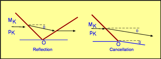 In supersonic flow waves are the main source of drag. Drag may be reduced by "removing" the waves from the system. For the example of a shock impinging on a solid wall, this produces a reflected shock. The latter occurs in order to turn the flow to be parallel to the wall. If the wall itself, at the point (0), was turned through an angle $θ$ (Fig. 48), then the flow follows the wall and there is no need for a reflected shock. This phenomenon can also be interpreted as saying that an expansion wave is produced at (0) that cancels the reflected shock. Now the system is free of waves and so free of wave drag.
