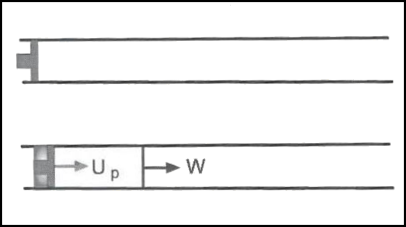 The speed of the shock wave will be $W$ while the speed of the piston is $U_p$ . The shock wave is moving faster than the local speed of sound in the gas and is moving faster than the piston. The gas entrapped between the piston and the shock wave will be shown to also be moving at the same speed as the piston. This is referred to as Shock Induced Motion.