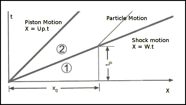 The motion of shock wave and piston can be represented by plotting position versus time in an x-t diagram. Since the shock and piston are moving at constant speed, their paths on the x-t diagram will be straight lines. The diagram can also be used to trace the path of any particular particle. If a particle is located at $x= x_0$ at time $t=0$ then it will remain stationary until impacted by the shock wave. At the time of impact $t=t_0$ the particle starts to move with a speed $U_p$ and its path is parallel to that of the piston.