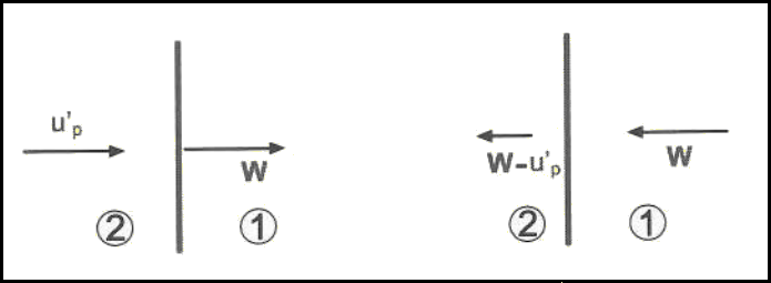$P_1+ρ_1W^2=P_2+ρ_2(W-u^'_p)^2$ --- conservation of momentum