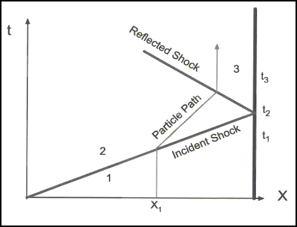 The sequence of events is shown in Fig.63 The incident shock is travelling toward the wall at $t=t_1$ and hits the wall at $t=t_2$ . It is then reflected and moves to the left at a speed of $W_R$. The stationary wall will bring the flow to rest so the gas in state (3) , between the reflected wave and the wall, is stationary. The reflected shock has the opposite effect on the flow as compared to the initial moving shock. The kinetic energy of the moving gas ((2)) is converted to internal energy ((3)). The effect is to produce a high temperature and pressure in region ((3)).