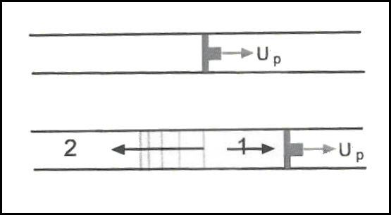 In a previous section the formation of a shock in a piston-cylinder arrangement was shown. The cylinder is filled with gas at rest. At $t=0$ the piston is pushed at high speed to the right (Fig 59). If the piston speed is sufficiently high the compression waves produced will coallese and form a shock wave that is moving to the right.