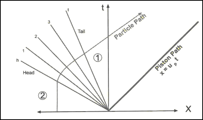 Fig. 66 shows this process on an x-t diagram. The gas expansion happens between a leading wave (Head Wave) and a final wave (Tail Wave). The Head Wave moves into a medium at rest and initiates motion. The subsequent waves increase the gas motion and the final Tail Wave is the one that expands the gas fully so that it is moving with the same speed as the piston, $U_p$.