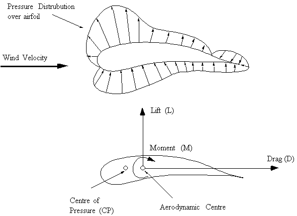 Both these resultants act through the centre of pressure (CP) of the airfoil. But as this point will move depending on the attitude of the airfoil to the incoming wind, the lift and drag forces are moved to act about the aerodynamic centre (AC) (the quarter chord). This means that an extra Moment (M) needs to be included to keep the system in equilibrium.