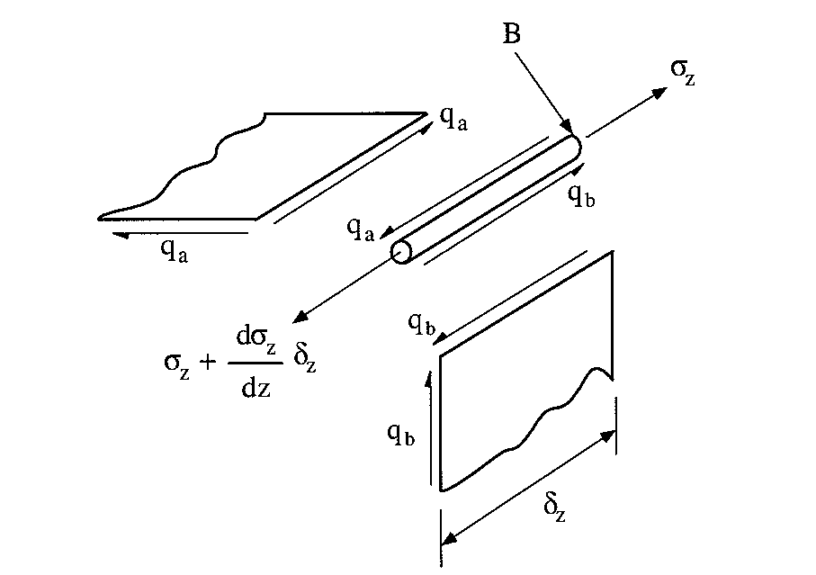 $$ Σ F_z = 0 = ( σ_z + {∂σ_z}/{∂z} δ z ) B - σ_z B + q_a δz - q_b δ z $$which simplifies to: