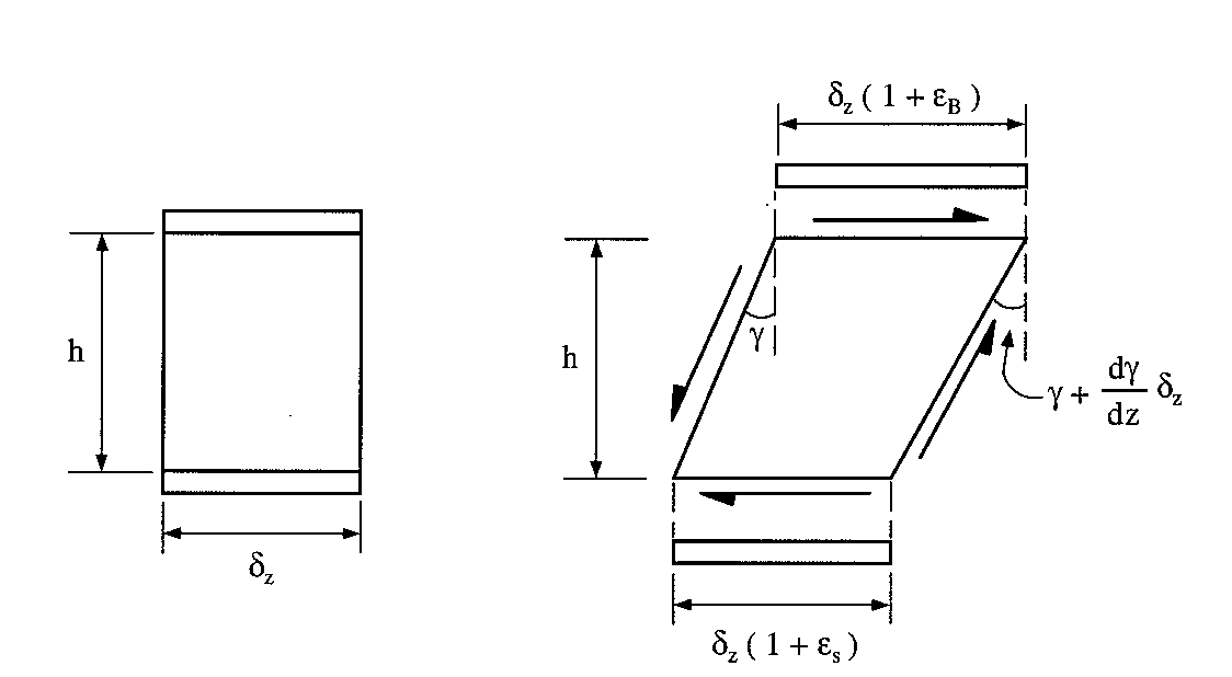 $$ δz ( 1 + ε_B ) = δz ( 1 + ε_S ) + {∂γ}/{∂z} δz h $$which simplifies to give: $$ {∂γ}/{∂z} = 1/h ( ε_B - ε_S ) $$