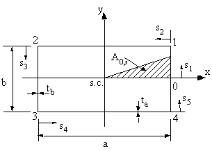 $$ δ_{0s_4} = a/{t_a}+ {3b}/{2t_b} + {s_4}/{t_a} \text" and " A_{0s_4} = {5ab}/8 + {bs_4}/4 $$All of which gives a linear equation for the warping on all four sides of the section. Meaning that we need only look at the corners because here the warping is the greatest.