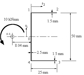 Determine the maximum shear stress τmax, the rate of twist and the warping for the open beam channel section of Figure 50 when a torque of magnitude T = 10 Nm is applied at the shear centre. Assume the material shear modulus to be and G = 25 GPa.|