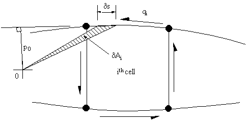 Look at the ith cell, the moment Mqi produced by the total shear flow about some point '0' is as follows: