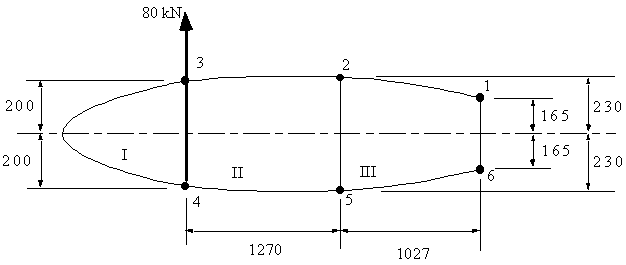The following wing section carries a vertical load of 80 kN in the plane of web 3-4, determine the shear flow distribution and the rate of twist. Boom areas, B1-6 = 2580 mm2, B2-5 = 3880 mm2, B3-4 = 3250 mm2.