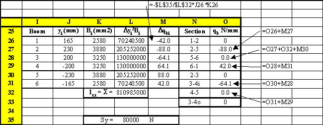Figure 93: Table where the open beam shear flows were calculated |