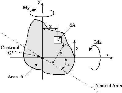 Consider a beam of arbitrary non-symmetrical cross section, which supports bending moments Mx and My, bending about some axis in the cross section. This is the plane of no bending stress, called Neutral Axis (N.A.).