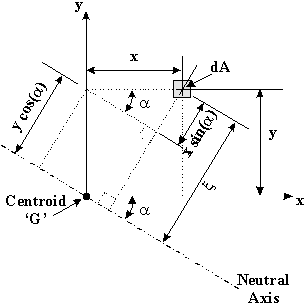 $$x↖{-} = { Σ x↖{-}_i * A_i }/{ Σ A_i} \text" , " y↖{-} = { Σ y↖{-}_i * A_i }/{ Σ A_i}$$For a beam with a symmetrical cross section, the centroid is the point defined by equation 3.3 and the Neutral Axis is parallel to the x and y axis. For a non-symmetrical beam cross section however, the Neutral Axis passes at some angle α with respect to the x-axis. What needs to be done is to define the angle of the neutral axis (N.A.)